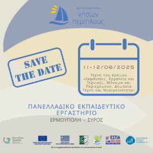 Στο πλαίσιο της Ενέργειας “Εκπαιδευτικές Δράσεις” καλεί τους ενδιαφερόμενους να υποβάλλουν αίτηση συμμετοχής στο Πανελλήνιο Επιμορφωτικό Εργαστήριο με θέμα «Τέχνη του Δρόμου “Εκφάνσεις, Εργαλεία και Τεχνικές, Μήνυμα και Περιεχόμενο, Δημόσια Τέχνη και Νησιωτικότητα”», το οποίο θα πραγματοποιηθεί στην Ερμούπολη της Σύρου στις 11 και 12 Ιουνίου 2025.